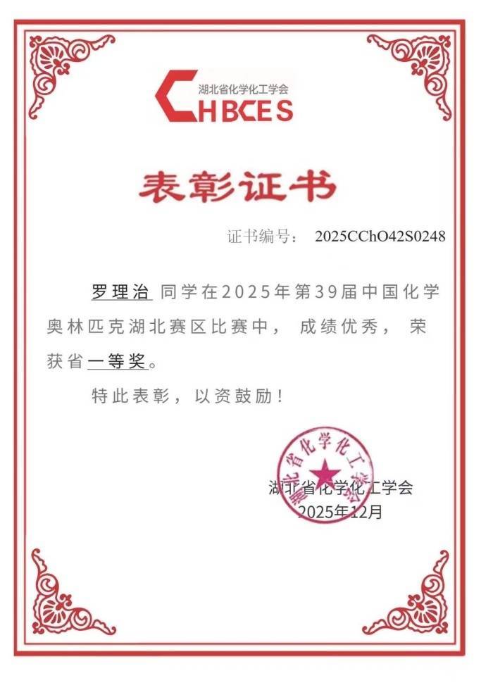 在第三十九届中国化学奥林匹克(湖北赛区)中,该校高三(5)班学生罗理治在指导教师邵素芳的指导下,凭借扎实的专业功底与稳定的临场发挥,荣获湖北省一等奖。在第二十二届“外研社杯”全国中学生外语素养大赛湖北赛区决赛中,高三(6)班学生许心籽在指导教师陈蓉的专业辅导下,以流利的语言表达与出色的综合能力,同样摘得湖北省一等奖。
